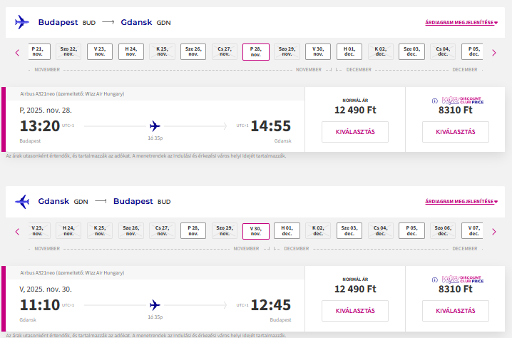 Repülőjegy: Wizz Air, Budapest-Gdansk oda-vissza 16.620 Ft(Wizz tagságival, anélkül 24.980 Ft) Foglalás ITT