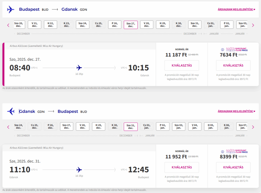 Repülőjegy: Wizz Air, Budapest-Gdansk oda-vissza 16.033 Ft(Wizz tagságival, anélkül 23.138 Ft) Foglalás ITT