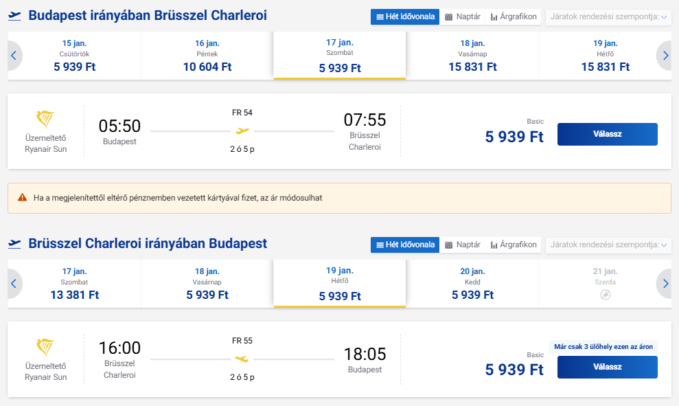 Repülőjegy: Ryanair, Budapest-Charleroi, oda-vissza 11.878 Ft. Foglalás ITT