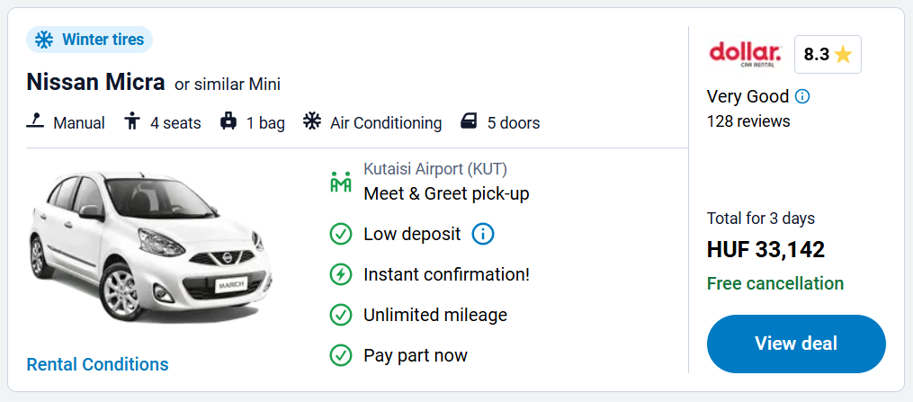 Transzfer: Kutaisiből vonattal vagy busszal is el lehet jutni Batmiba. Részletek ITT A Georgian Bus Kutaisi Repülőtér és Batumi között a járatokhoz igazítva közlekedtet buszokat, a jegy ára egy útra 25 Lari(kb. 3.000 Ft). Részletek ITT