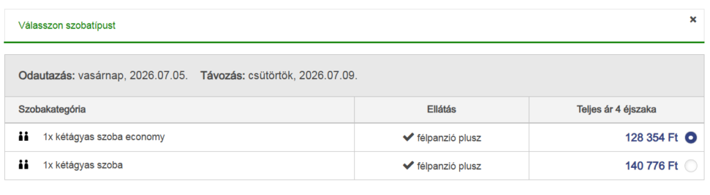 Például 2026. július 5-i indulással 2 fő részére 4 éjszaka „félpanzió plusz” ellátással 128.354 Forint. Foglalás ITT