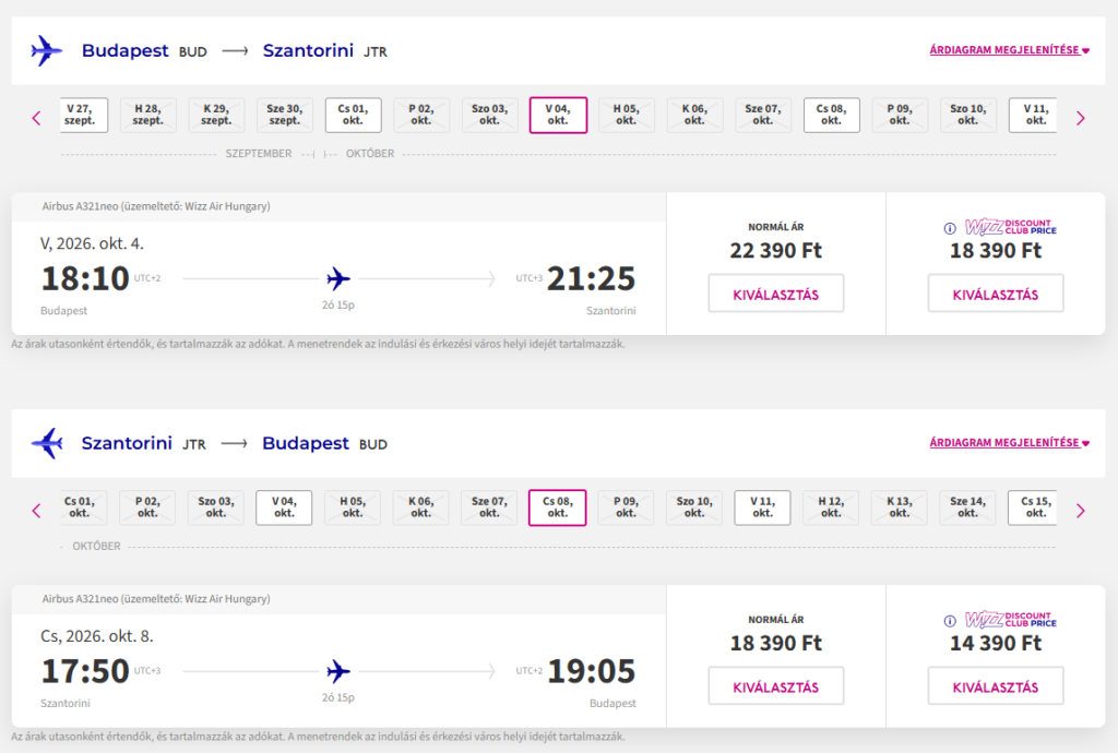 Repülőjegy: Wizz Air, Budapest-Santorini oda-vissza 32.780 Ft(Wizz tagságival, anélkül 40.780 Ft) Foglalás ITT