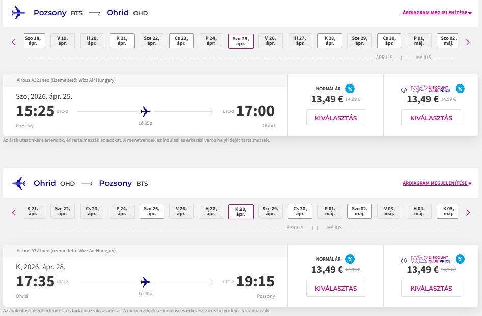 Repülőjegy: Wizz Air, Pozsony-Ohrid oda-vissza 26,98 Euró, kb. 10.252 Ft Foglalás ITT