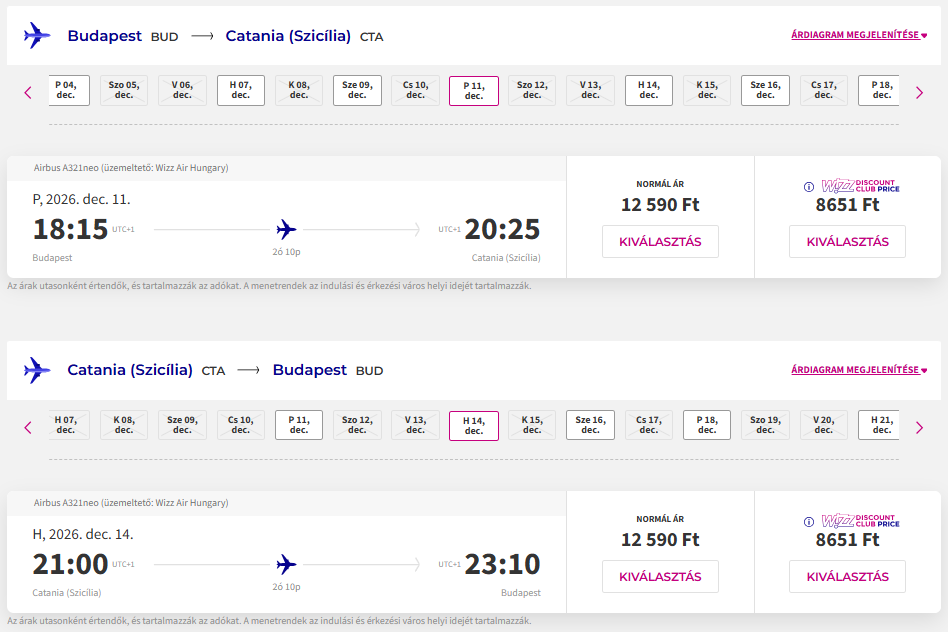 Jó áron foglalhattok repülőjegyet decemberben Szicíliába! Miért lehet jó ez? Mert jó eséllyel a Wizz módosítani fogja decemberig az indulási időpontot, ekkor pedig -14 és +30 napon belül módosíthatjátok a repjegyet, azaz ingyen áttehetitek karácsonyra vagy Szilveszterre is.