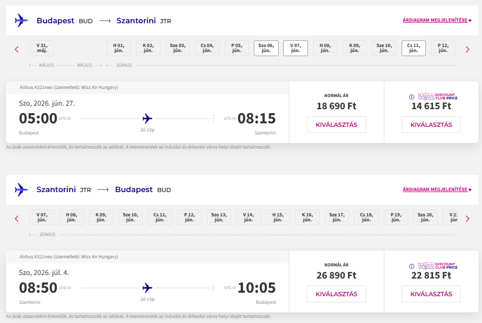 Repülőjegy: Wizz Air, Budapest-Santorini oda-vissza 37.430 Ft(Wizz tagságival, anélkül 45.580 Ft) Foglalás ITT