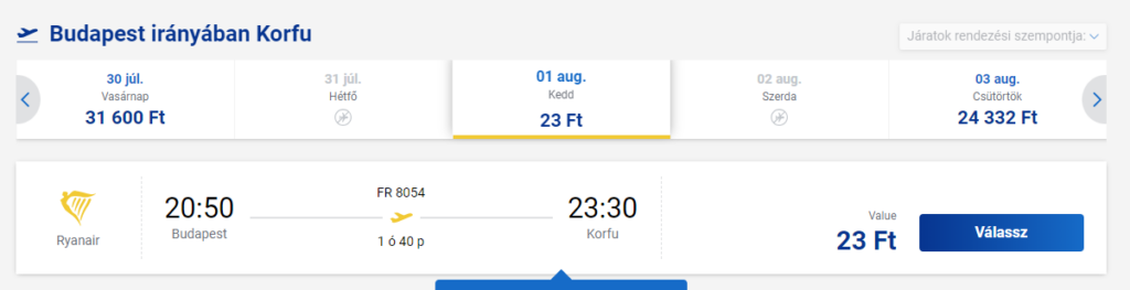 Hibásan árazta a Ryanair az augusztus 1-i Budapest-Korfu járatát, így a szemfülesek vásárolhatnak repülőjegyet 23 forintért. A visszaút a Ryanairnél sajnos drága, de érdemes megnézni több légitársaságot, valamint a debreceni, pozsonyi, vagy épp bécsi járatokat is a visszaúthoz.